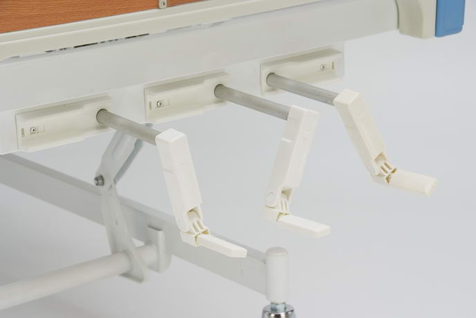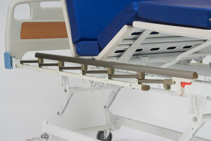 Боковые ограждения складные, выполнены из алюминия. Легко опускаются для облегчения доступа медицинского персонала к пациенту.